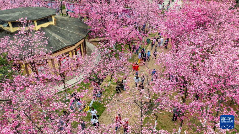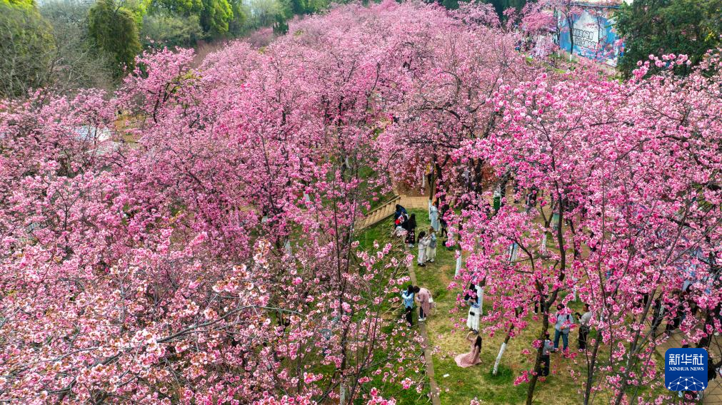 3月14日,人们在昆明圆通山公园观赏樱花(无人机照片)。
