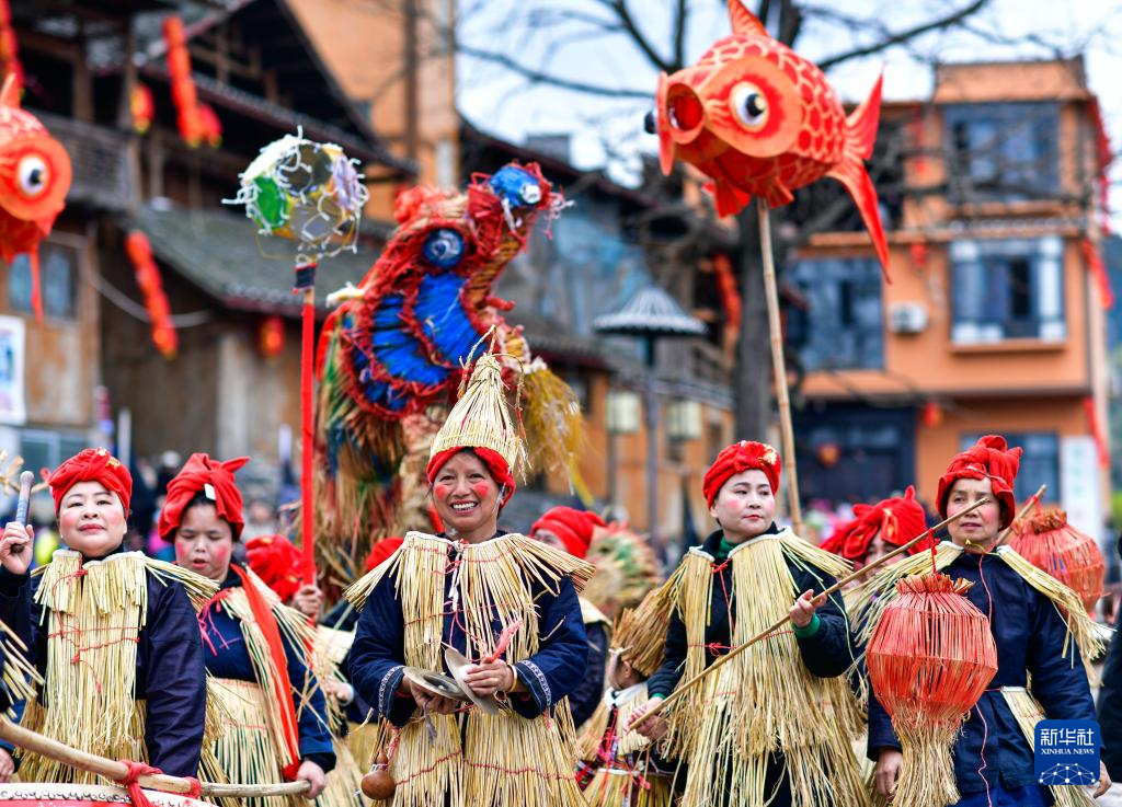 3月15日,当地群众在贵州省榕江县三宝侗寨“萨玛节”活动中舞稻草龙。