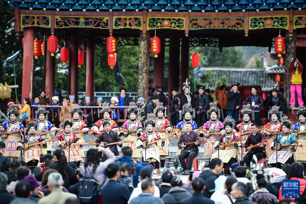 3月15日,在贵州省榕江县三宝侗寨,参加“萨玛节”活动的群众在弹唱侗族琵琶歌。