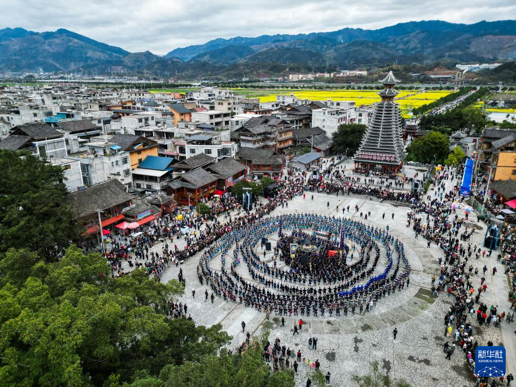 3月15日,当地群众在贵州省榕江县三宝侗寨“萨玛节”活动中跳“多耶舞”(无人机照片)。