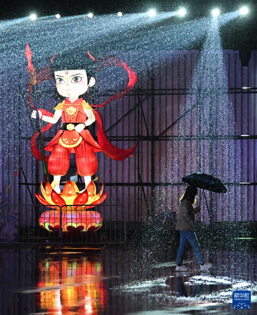 3月15日,在天津市河西区陈塘庄街道哪吒小镇,市民在春雪中赏灯。
