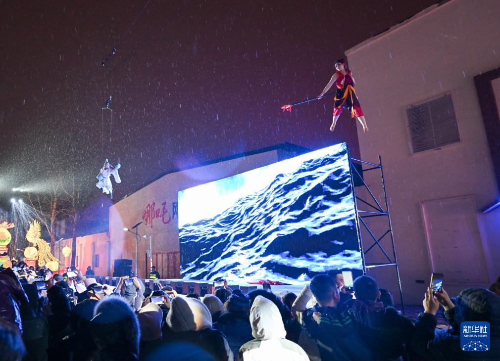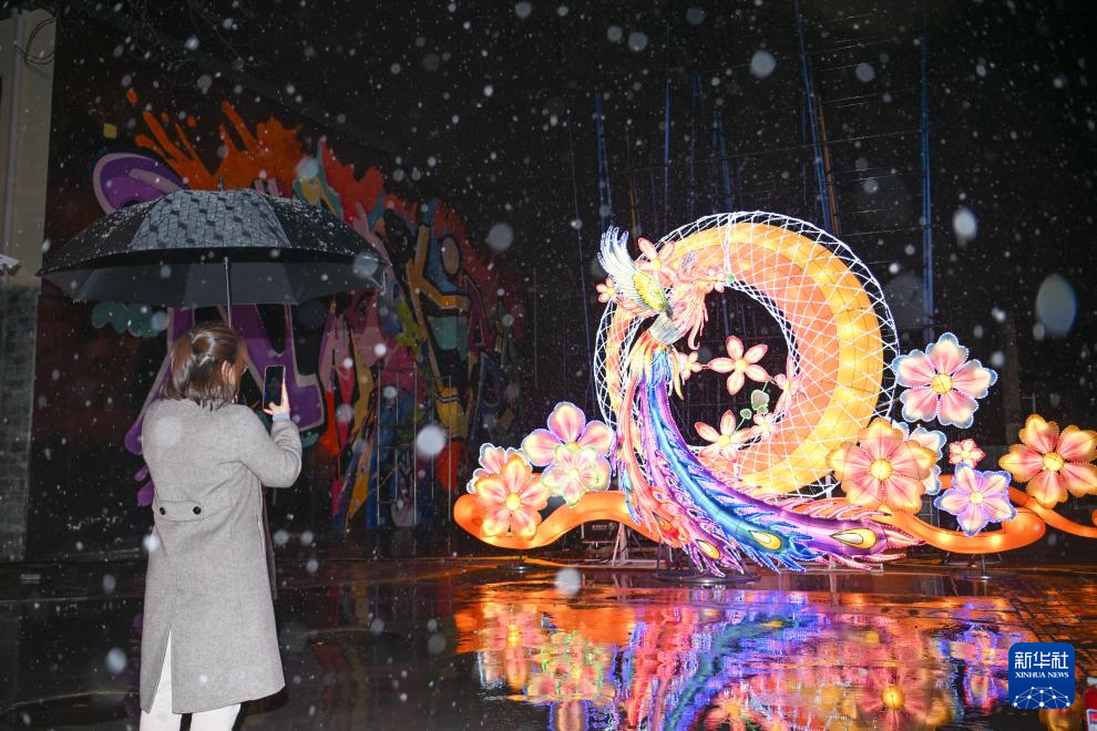 当日,天津出现降雪天气,市民来到天津哪吒小镇,在雪中看演出赏灯会,感受春雪带来的别样氛围。