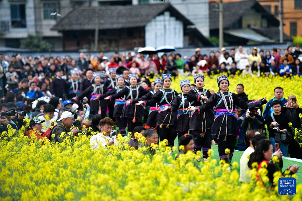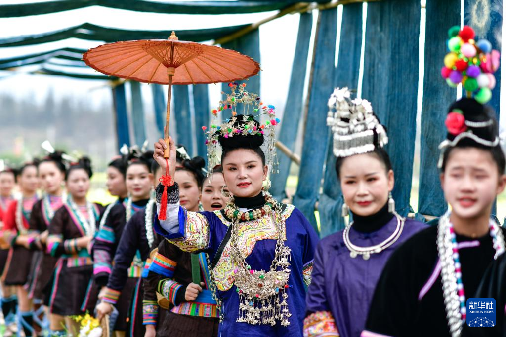 3月16日,在贵州省榕江县车江大坝,村民们穿着民族盛装参加花田走秀。