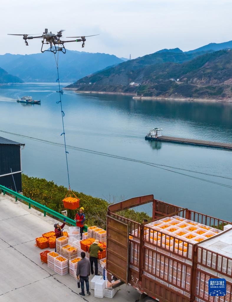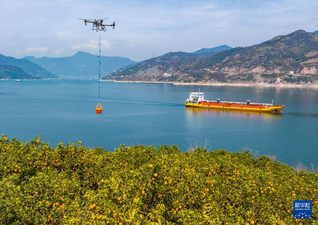 3月17日,湖北省秭归县郭家坝镇邓家坡村村民用无人机转运脐橙。