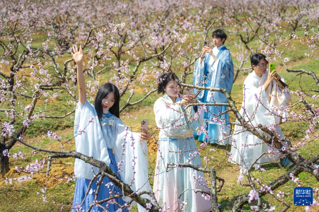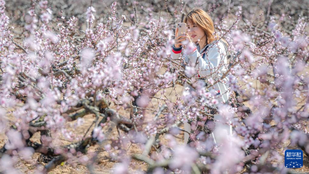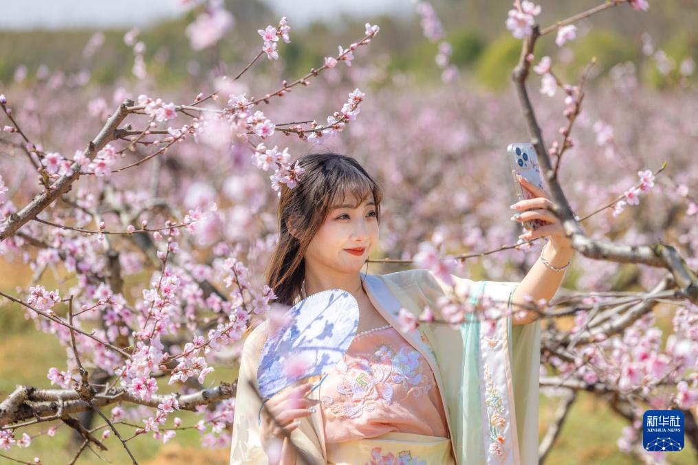 3月18日,游客在湖北省孝感市卓尔桃花驿小镇文化旅游节上赏花拍照。