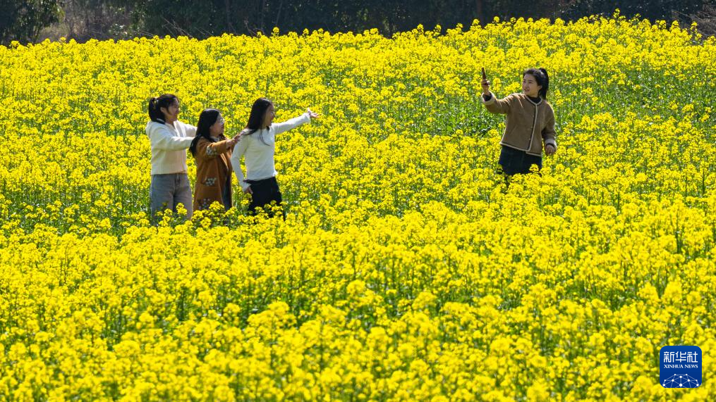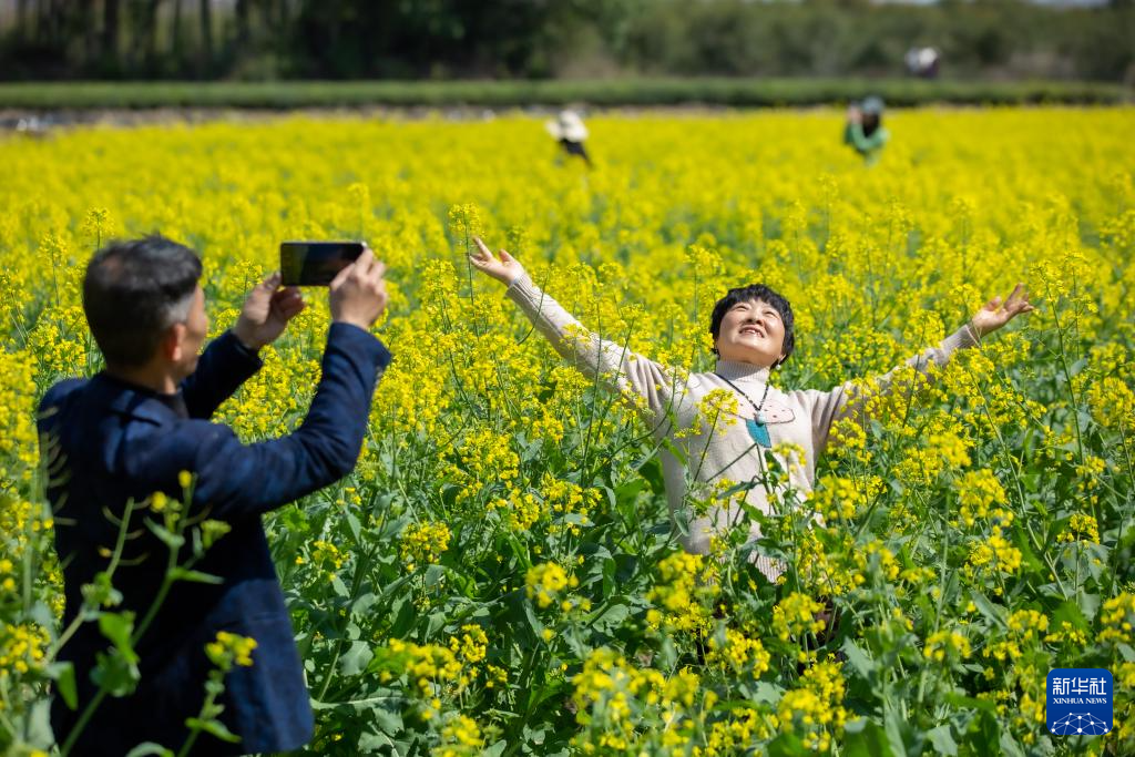 3月18日,游客在福建省武夷山市黄柏村的油菜花田间拍照。
