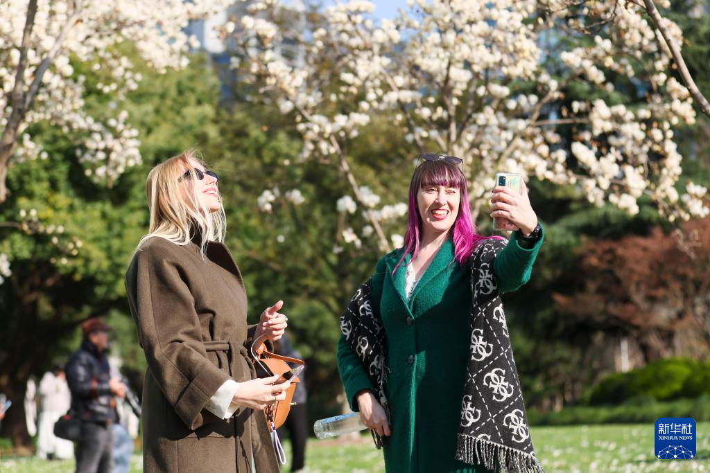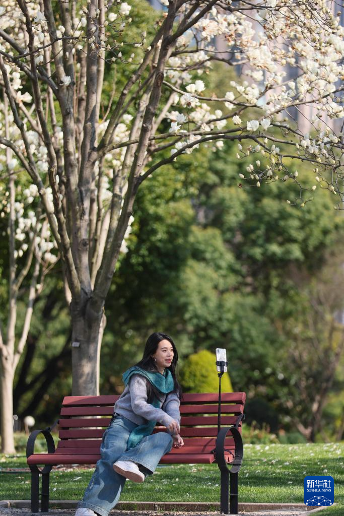 3月18日,游客在上海市陆家嘴中心绿地白玉兰树下自拍。