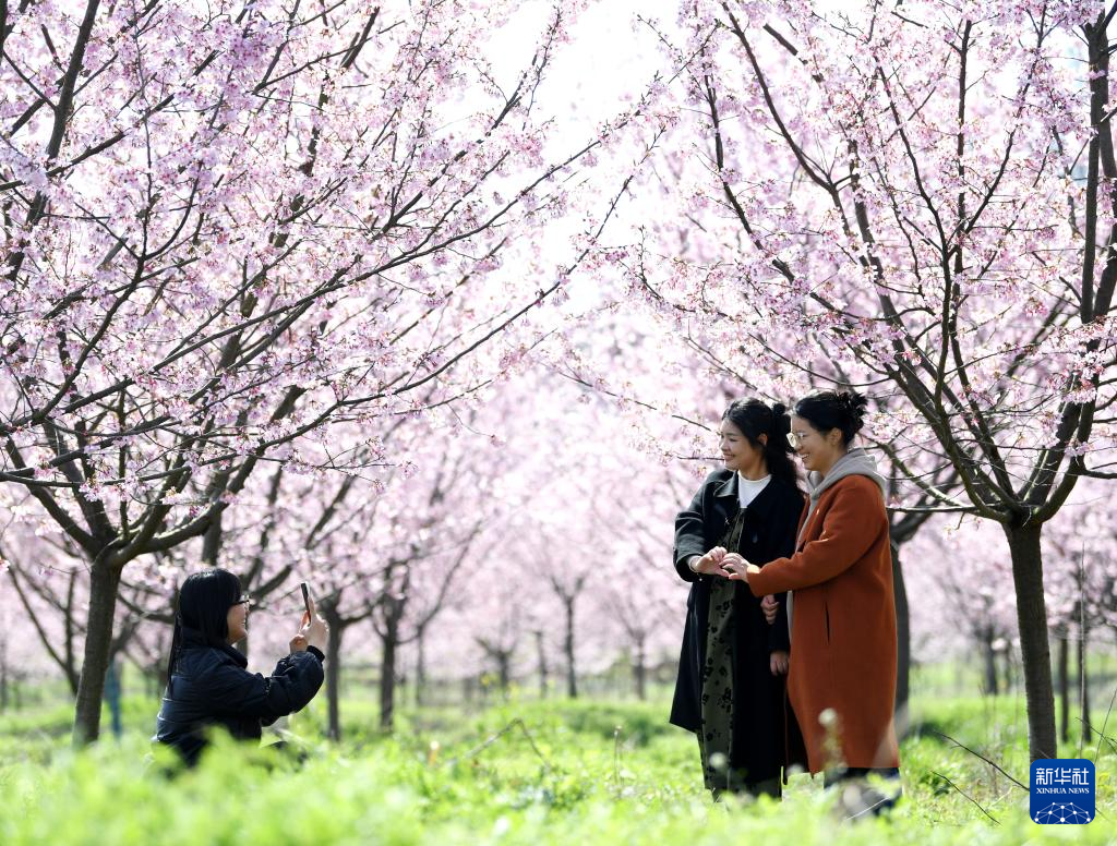 3月18日,游客在安徽省巢湖市苏湾镇寨山村樱花园内赏花拍照。