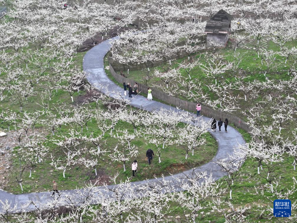 3月18日,游客在重庆市北碚区静观镇中华村山驿食集矿山果园赏花(无人机照片)。