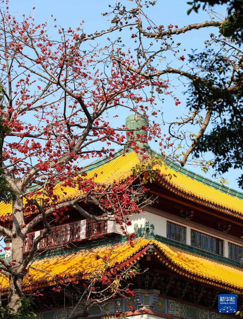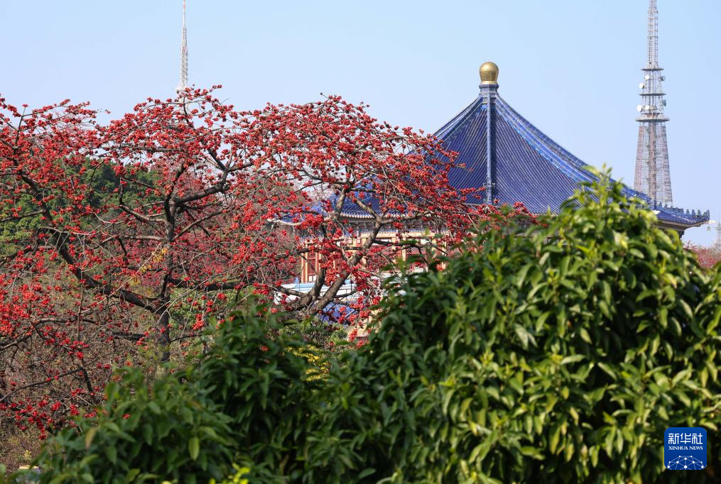 木棉花与广州中山纪念堂相映成趣(3月19日摄)。