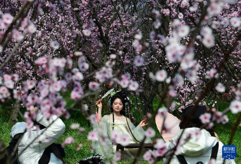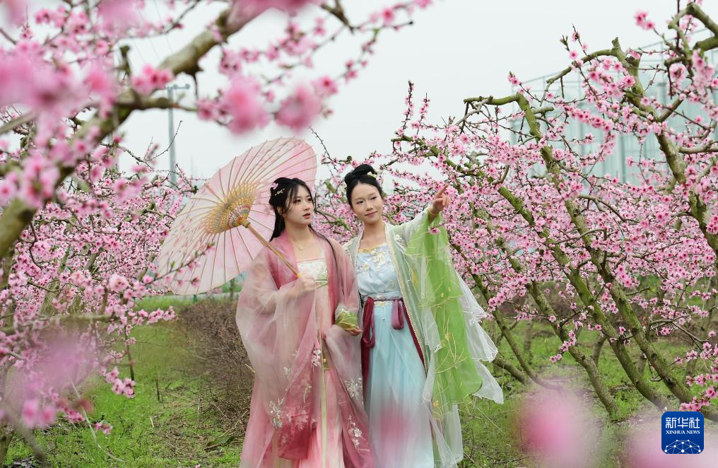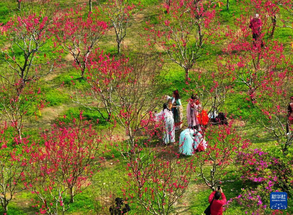 3月18日,游人身着汉服在四川省绵竹市富新镇文永村桃树下拍照。