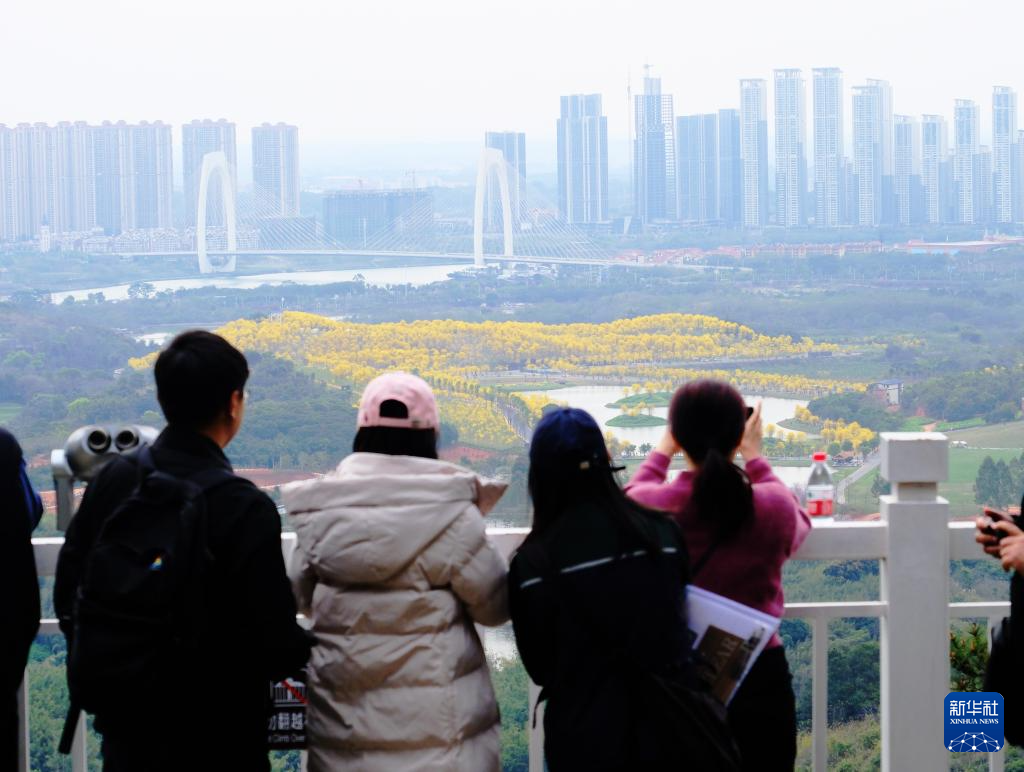 3月19日,游客在广西南宁市青秀山风景区观赏黄花风铃木。