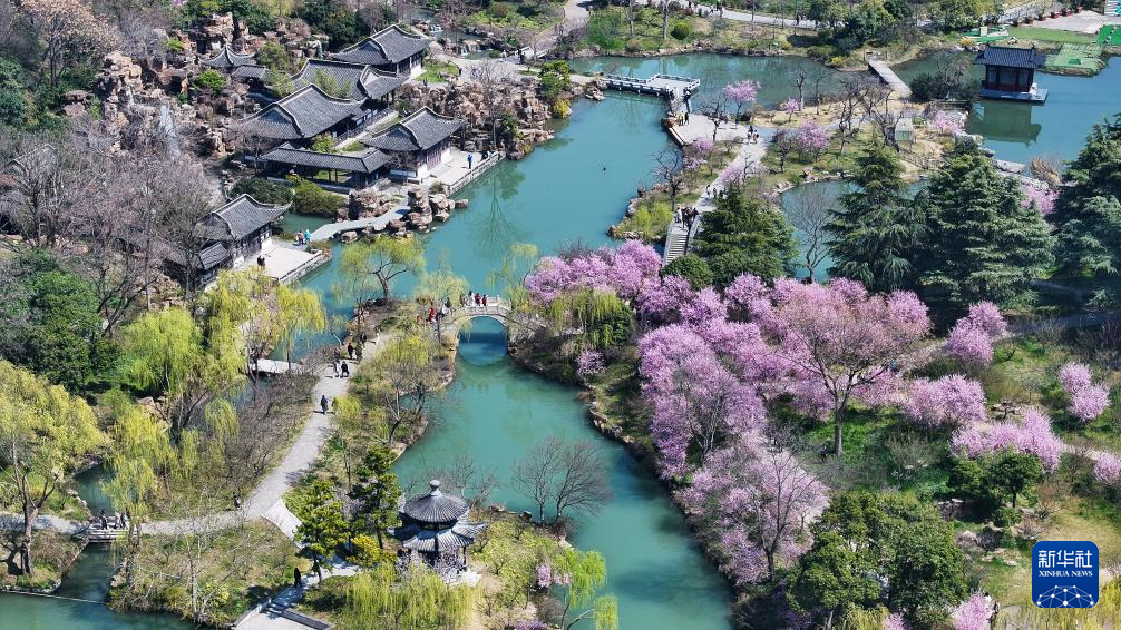 3月19日,游客在江苏扬州瘦西湖风景区踏春赏景(无人机照片)。
