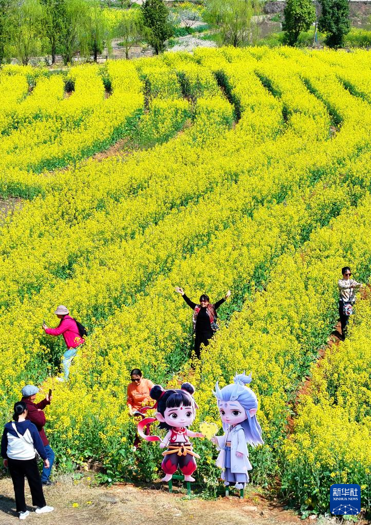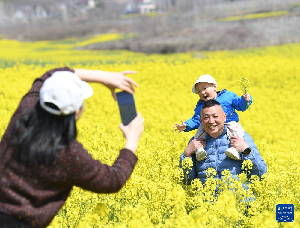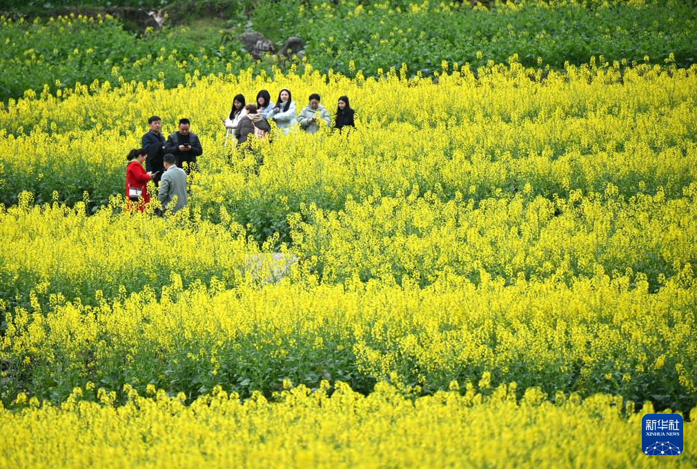 3月18日,游客在湖北省宣恩县长潭河侗族乡甘露梯田的油菜花间赏花游玩。