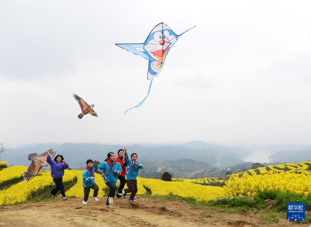 3月19日,四川省达州市达川区龙会乡中心学校学生在放风筝。