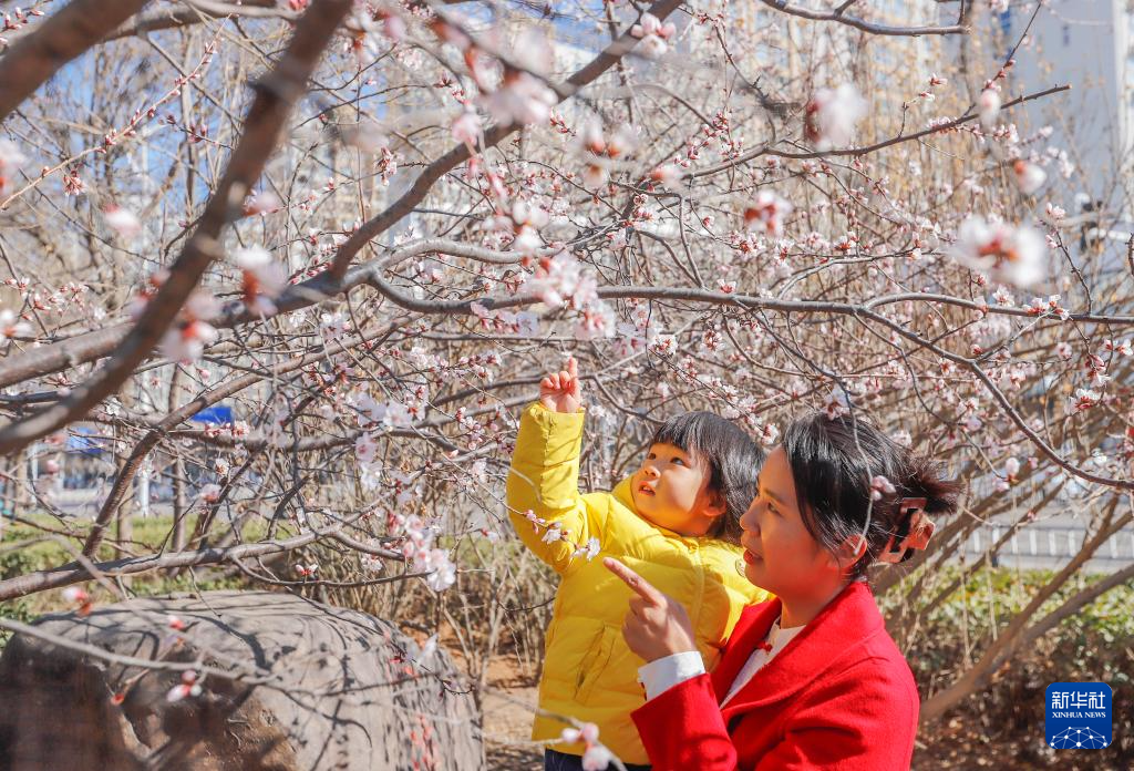 3月19日,家长和孩子在河北省遵化市一公园游玩赏花。