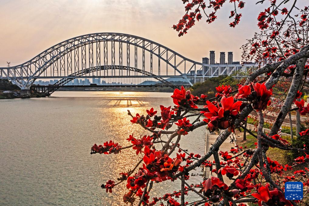 3月18日在广西南宁市邕江岸边拍摄的红木棉(无人机照片)。