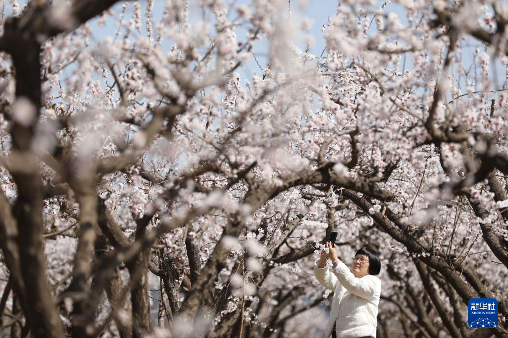 3月18日,游客在河南省焦作市温县北冷乡许北张村杏园里踏青赏花。