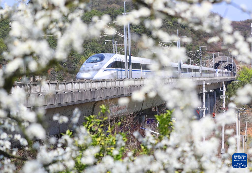一列高铁列车行驶在湖南省衡阳市衡山县萱洲镇春花盛开的田野上(3月19日摄)。