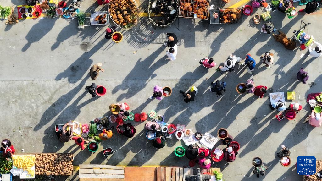 3月19日,当地居民在边城集贸大市场购买各类商品(无人机照片)。