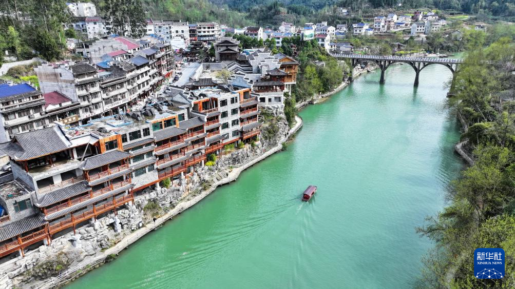 清水江穿流而过,左侧是湖南边城镇,右侧是重庆洪安镇(3月18日摄,无人机照片)。