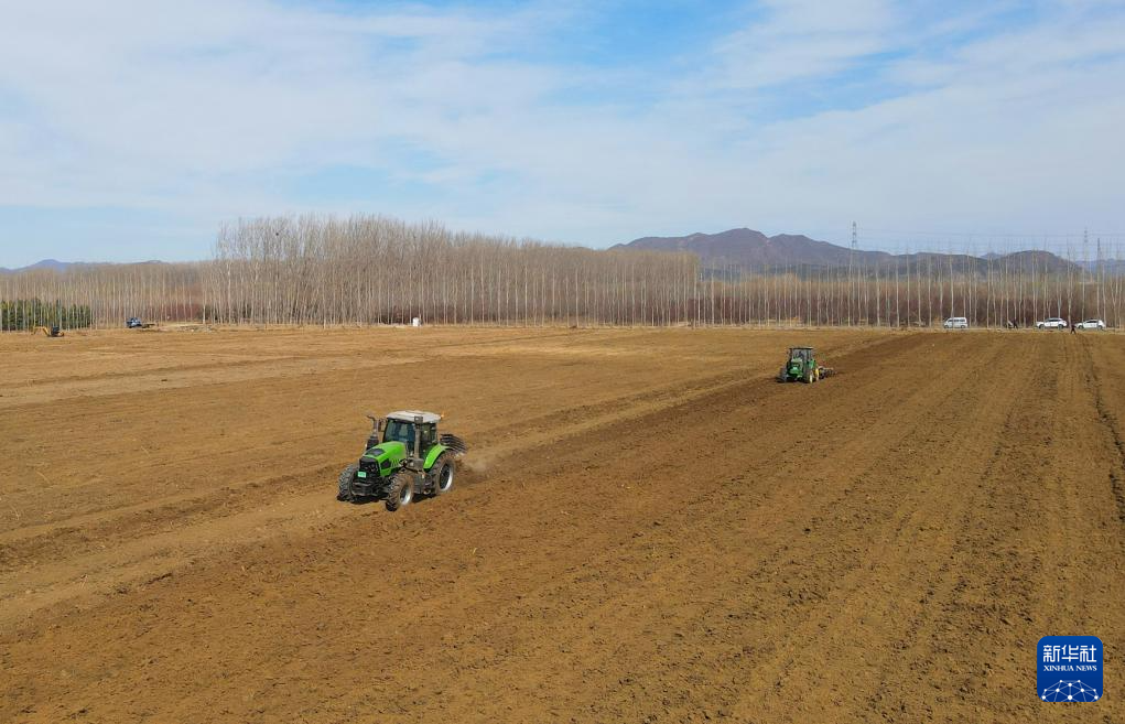 3月21日,在北京市平谷区峪口镇的一处农田,工作人员驾驶农机翻耕土地(无人机照片)。