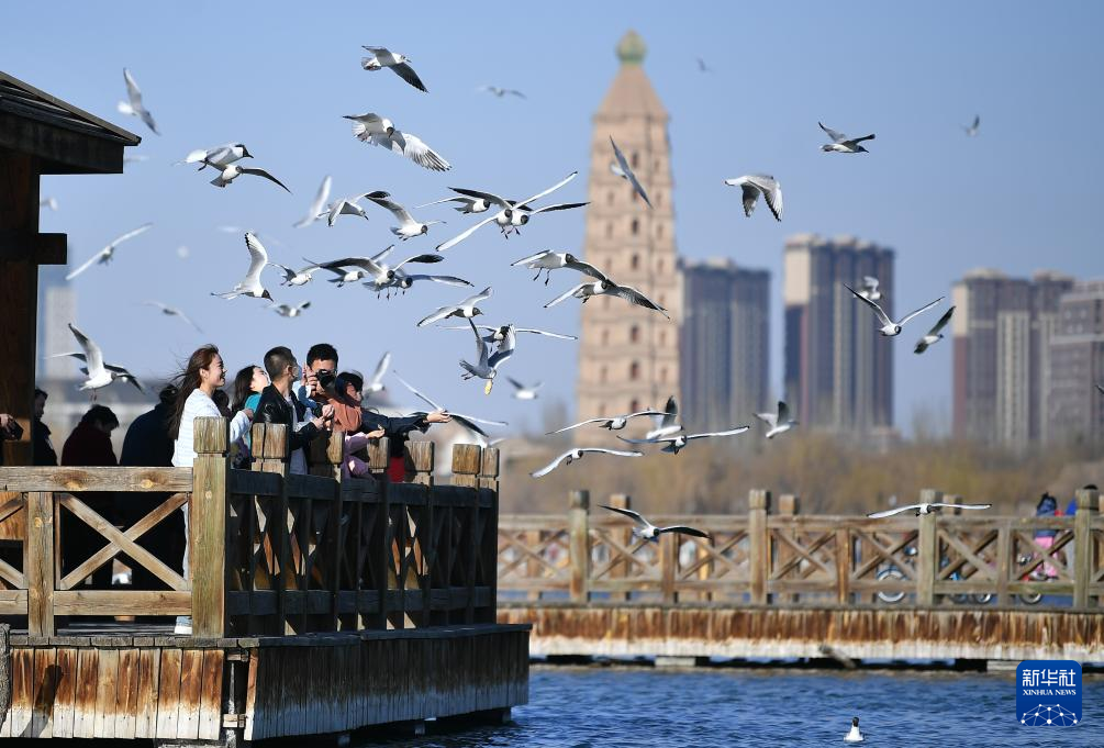 市民在银川市海宝公园观赏候鸟(2023年3月12日摄)。