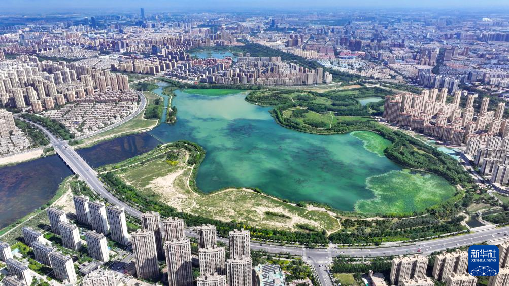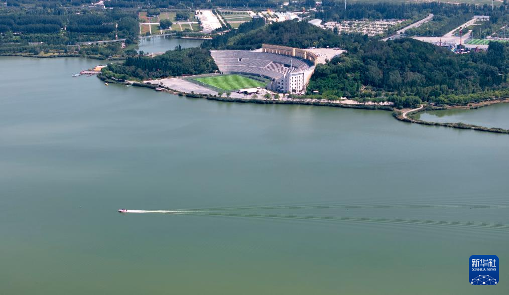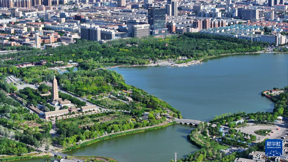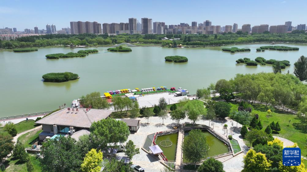 这是2024年6月23日拍摄的银川市北塔湖景色(无人机照片)。