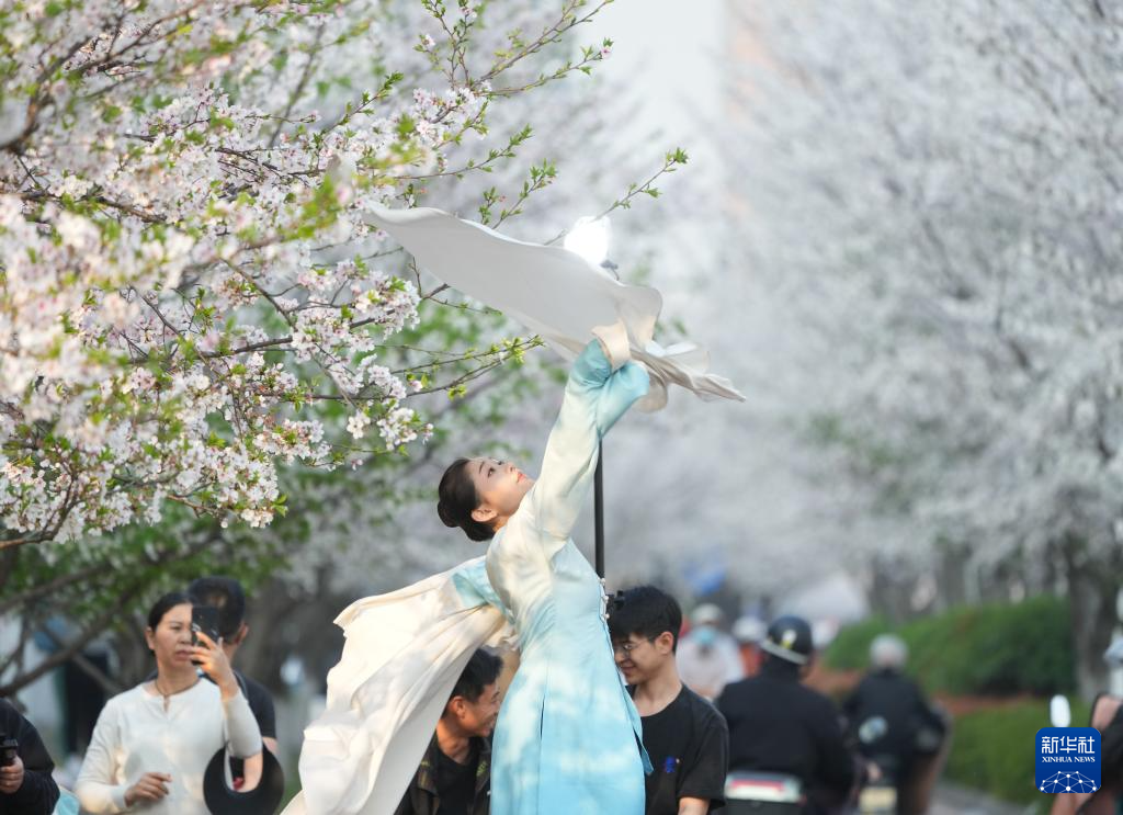 3月26日,一名着传统服饰的女子在樱花树间摆姿势拍摄短片。