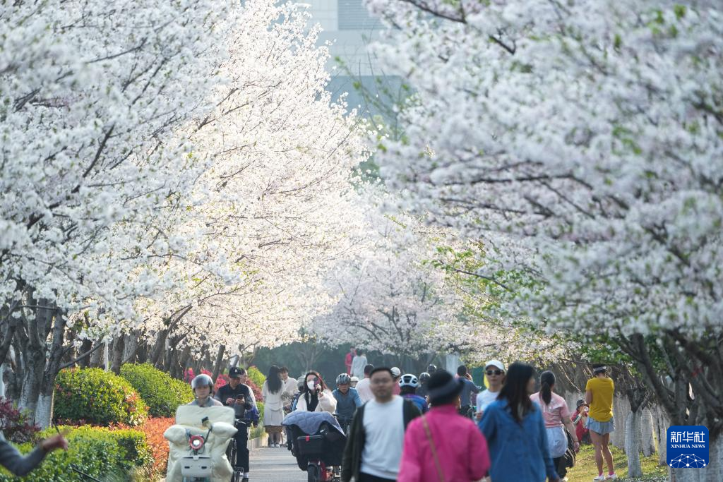 近日,浙江杭州滨江区闻涛路上的樱花跑道3000多株樱花进入盛花期,成为城市亮丽风景线。