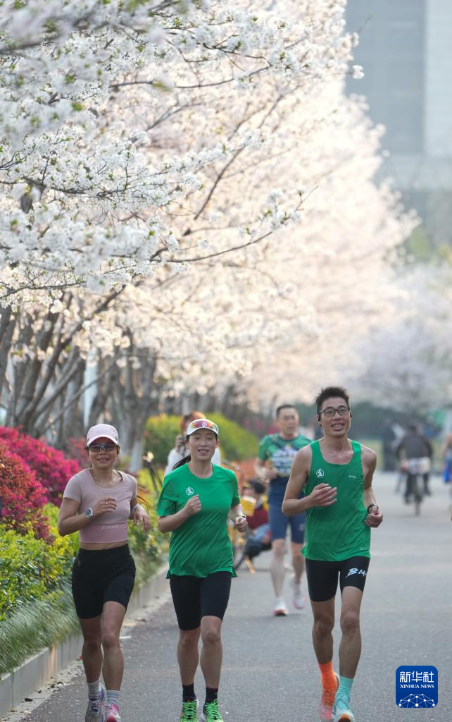 3月26日,人们在樱花跑道晨跑。