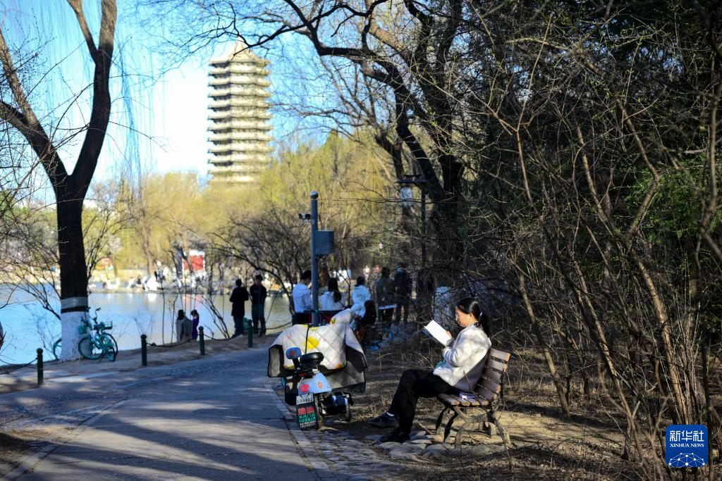 一名女子在北京大学未名湖畔阅读(3月20日摄)。
