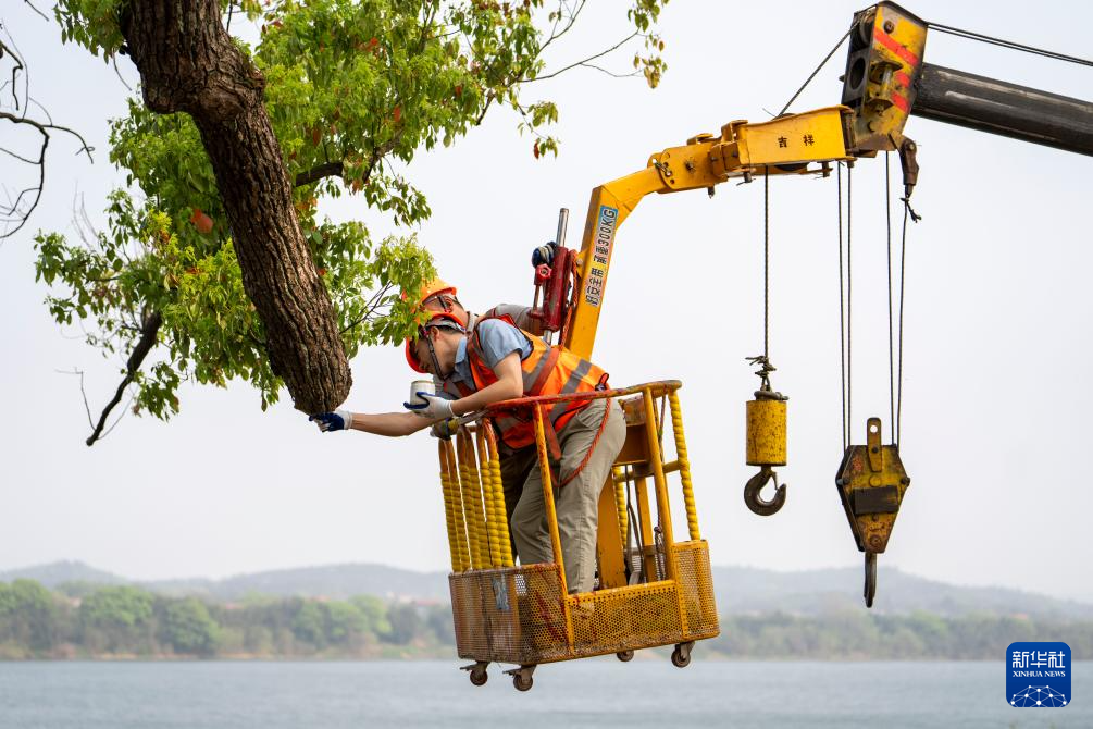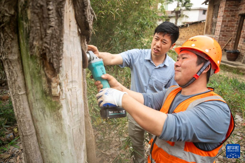 3月27日,在衡阳市衡山县长江镇新源村古树救治现场,吴磊(左)指导古树复壮工人打磨受伤古树的树干。