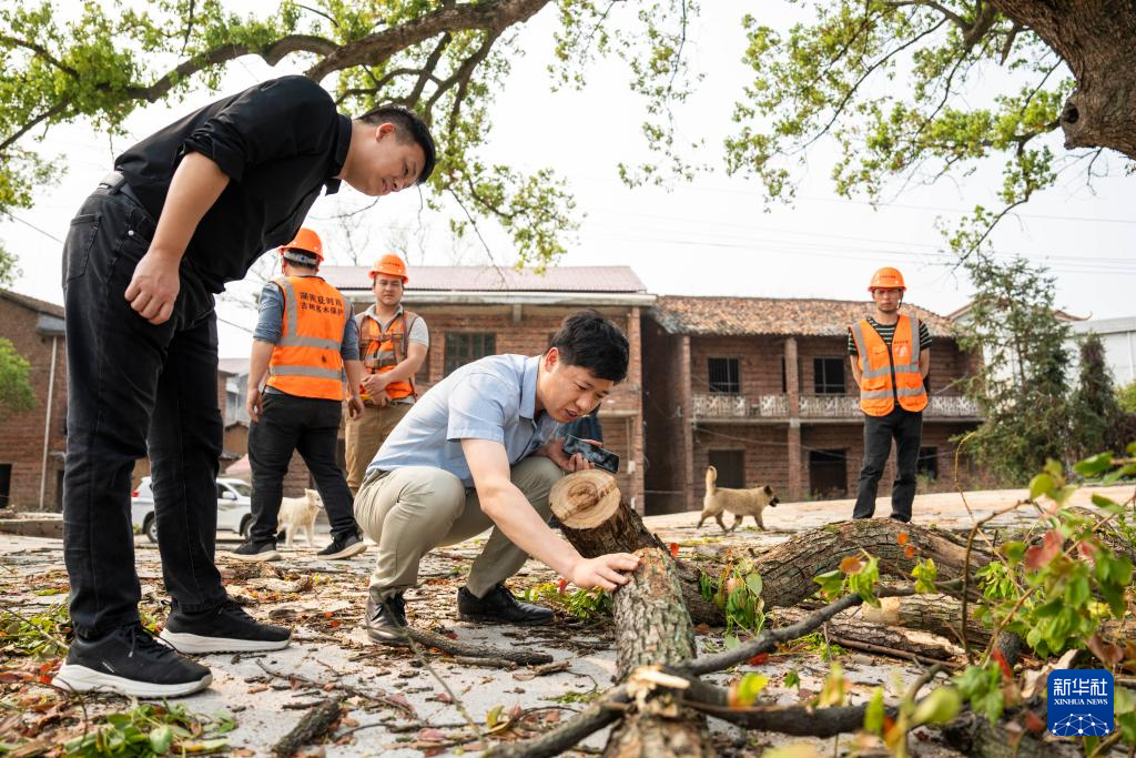 3月27日,在衡阳市衡山县长江镇新源村古树救治现场,吴磊(右二)根据枯枝诊断古树状态。