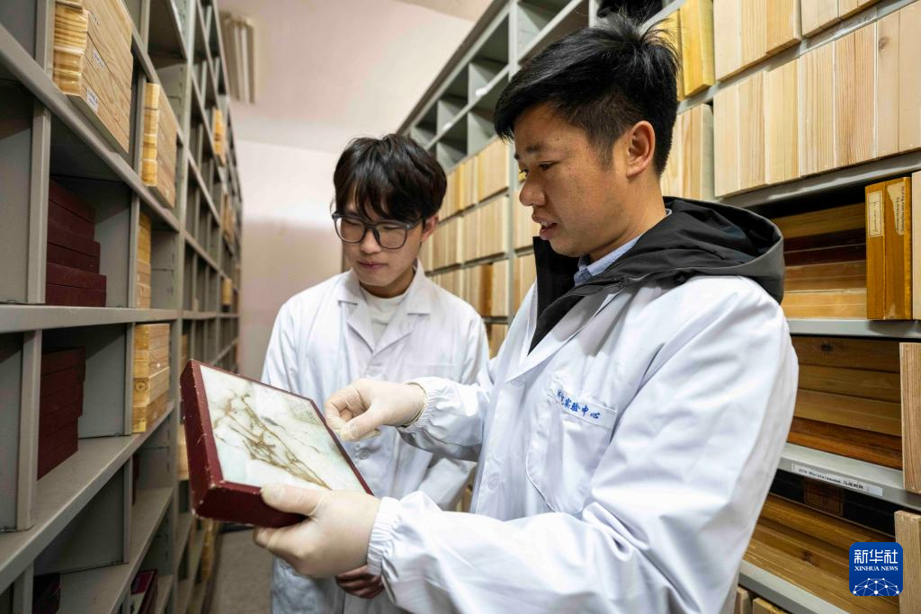 3月31日,在中南林业科技大学树木病虫害标本馆,吴磊(右)给学生讲解树木病害导致的症状。