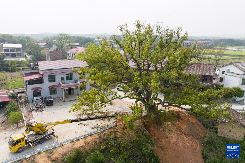这是3月27日在衡阳市衡山县长江镇新源村拍摄的古树救治现场(无人机照片)。