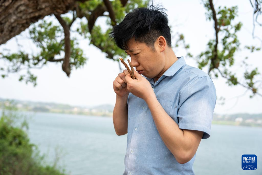 3月27日,在衡阳市衡山县长江镇新源村古树救治现场,吴磊通过枯枝气味诊断古树状态。