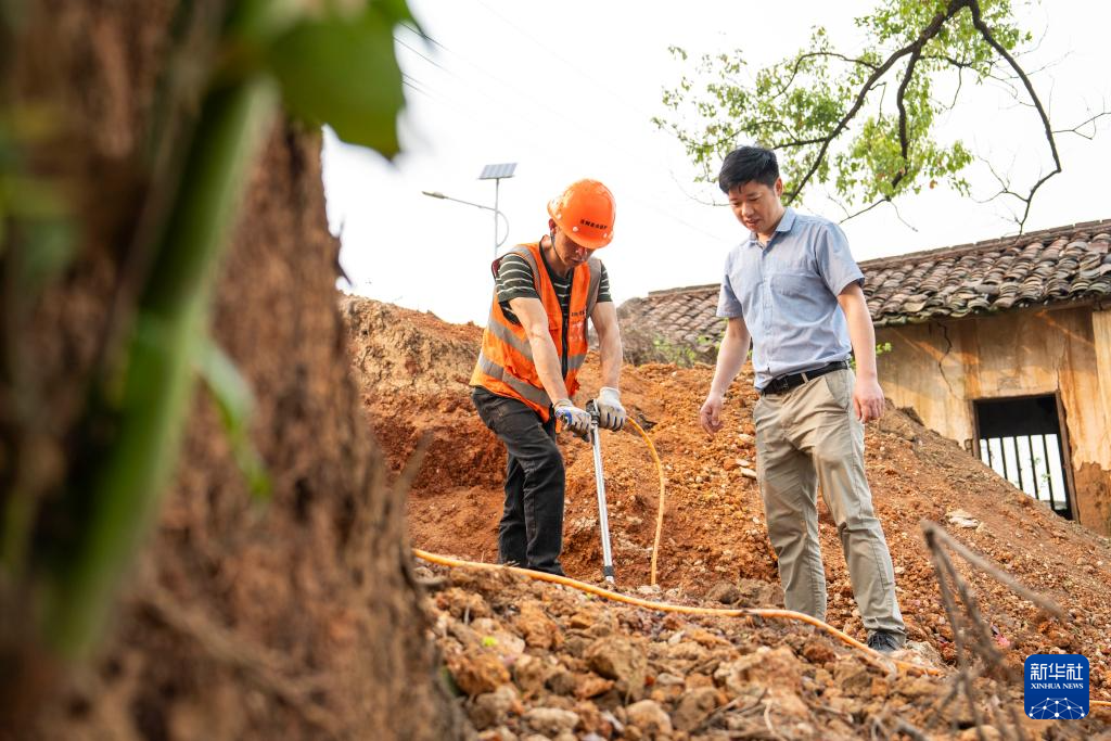 3月27日,在衡阳市衡山县长江镇新源村,吴磊(右)与古树复壮工人测量土壤参数。