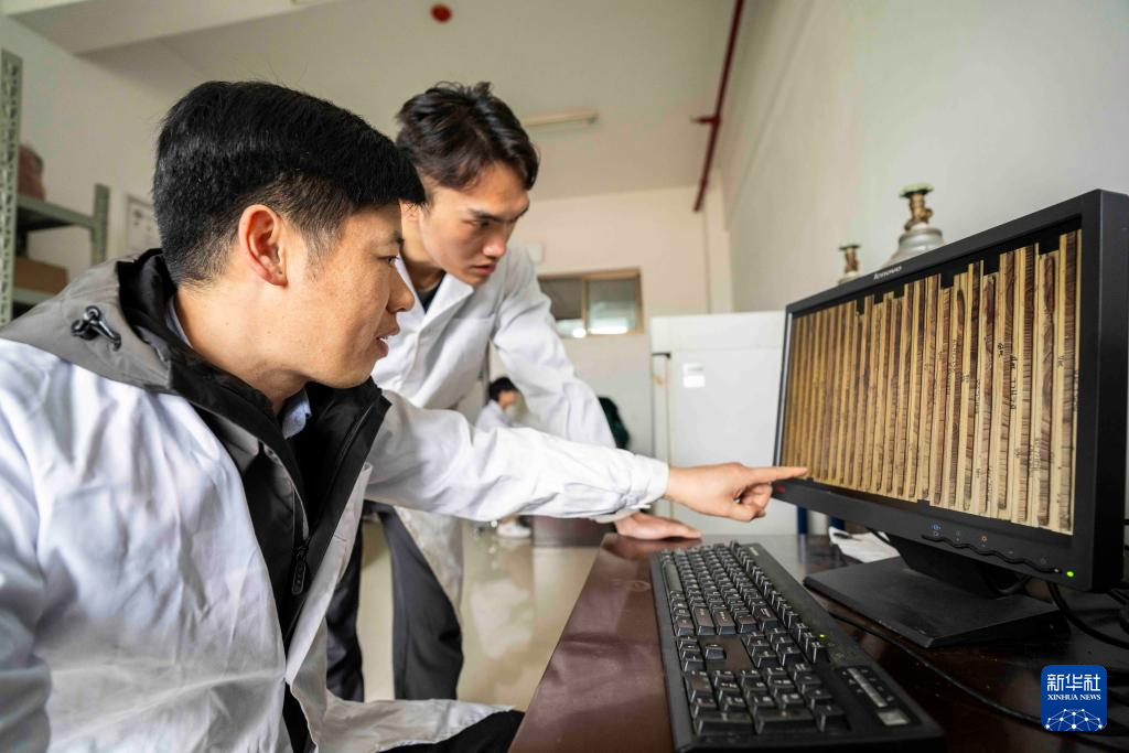 3月31日,在中南林业科技大学年轮鉴定实验室,吴磊(左)指导学生进行树龄鉴定。