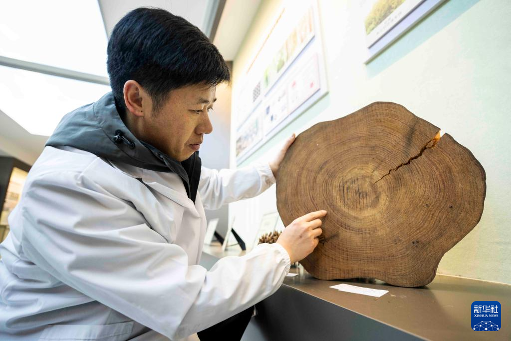 3月31日,吴磊在中南林业科技大学林学学科展厅介绍一颗古树标本的年轮。