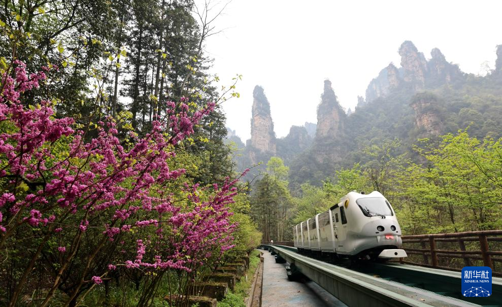 4月4日,游客乘观光电车在湖南张家界国家森林公园十里画廊游玩。
