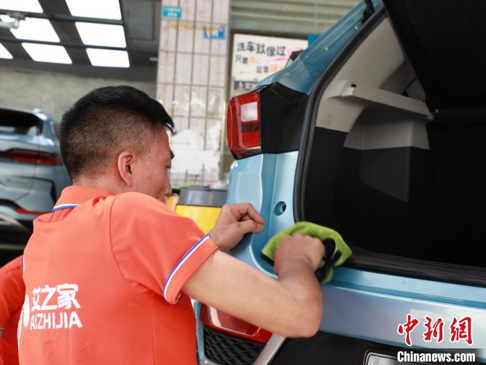 图为艾必齐正在为员工培训汽车美容相关技巧。金冠池 摄