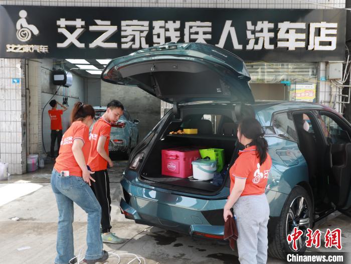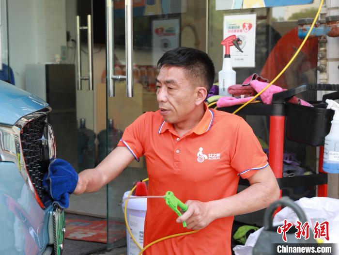 图为艾之家残疾人洗车店员工正在清洗车辆。金冠池 摄