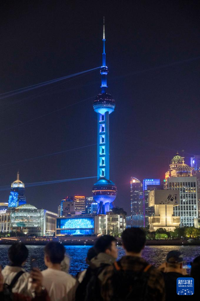 4月17日,人们在上海外滩拍摄对岸陆家嘴庆祝浦东开发开放35周年光影秀。新华社记者 王翔 摄