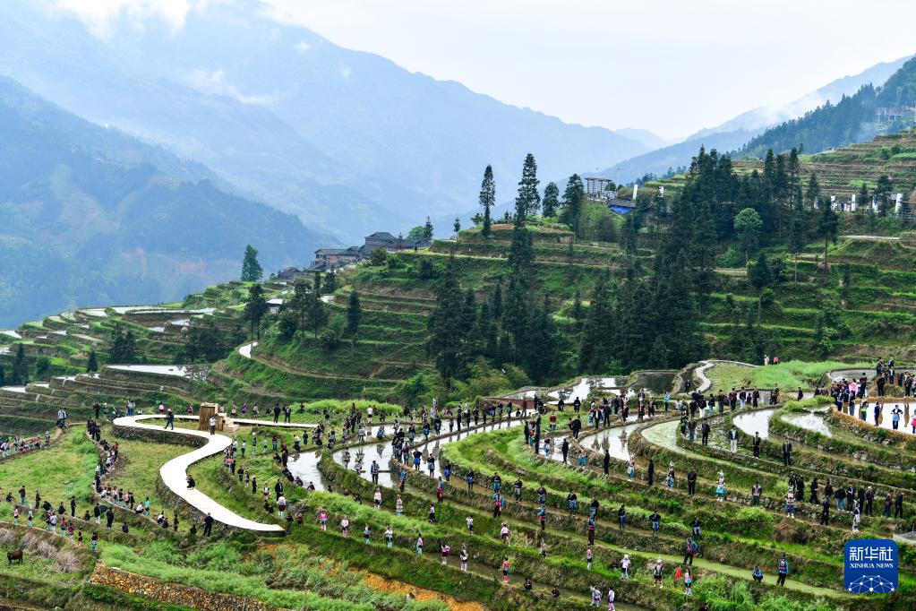 4月26日,村民在贵州省从江县加榜梯田上参加梯田走秀活动。