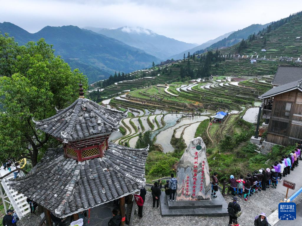 4月26日,游客在贵州省从江县加榜梯田上观看“开秧门”春耕仪式(无人机照片)。