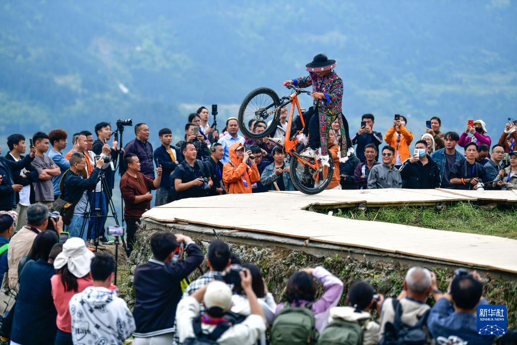 4月26日,表演者在贵州省从江县加榜梯田的梯田走秀活动上展示车技。