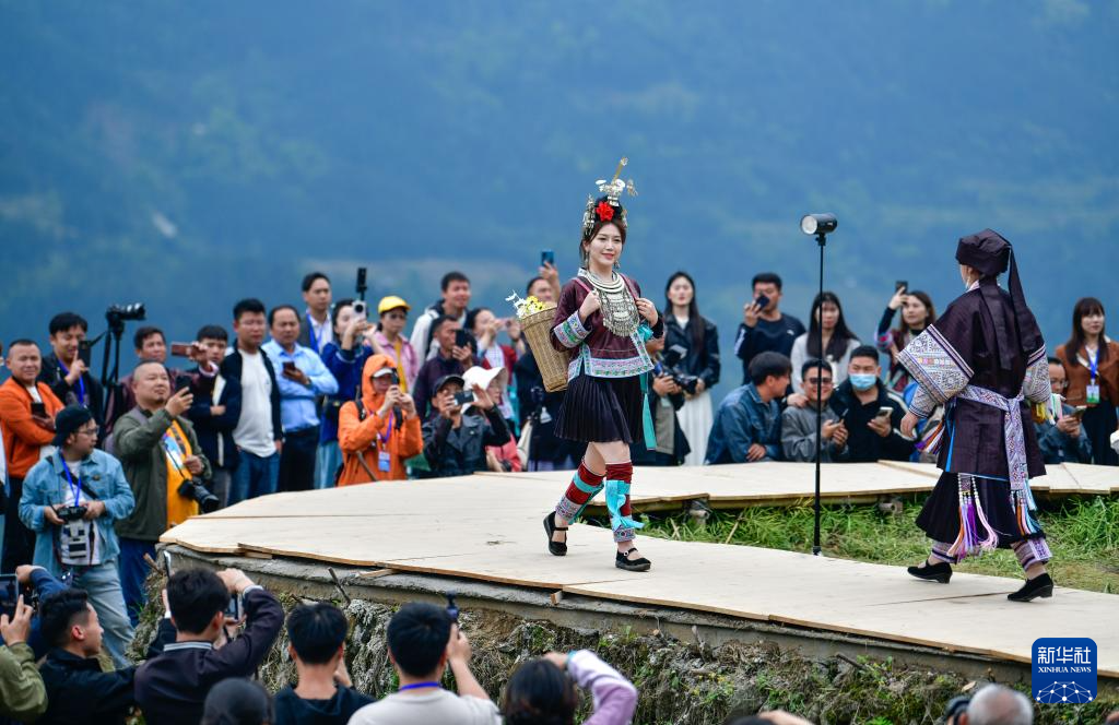 4月26日,模特在贵州省从江县加榜梯田上参加梯田走秀活动。