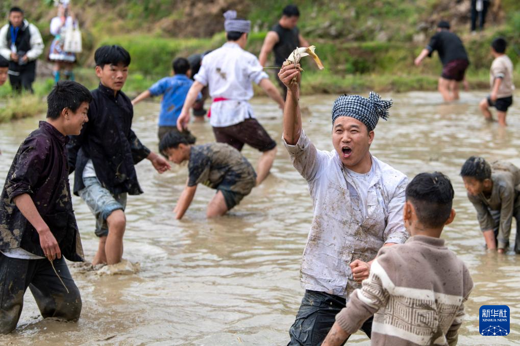 4月26日,村民在贵州省从江县加榜梯田上参加稻田抓鱼活动。