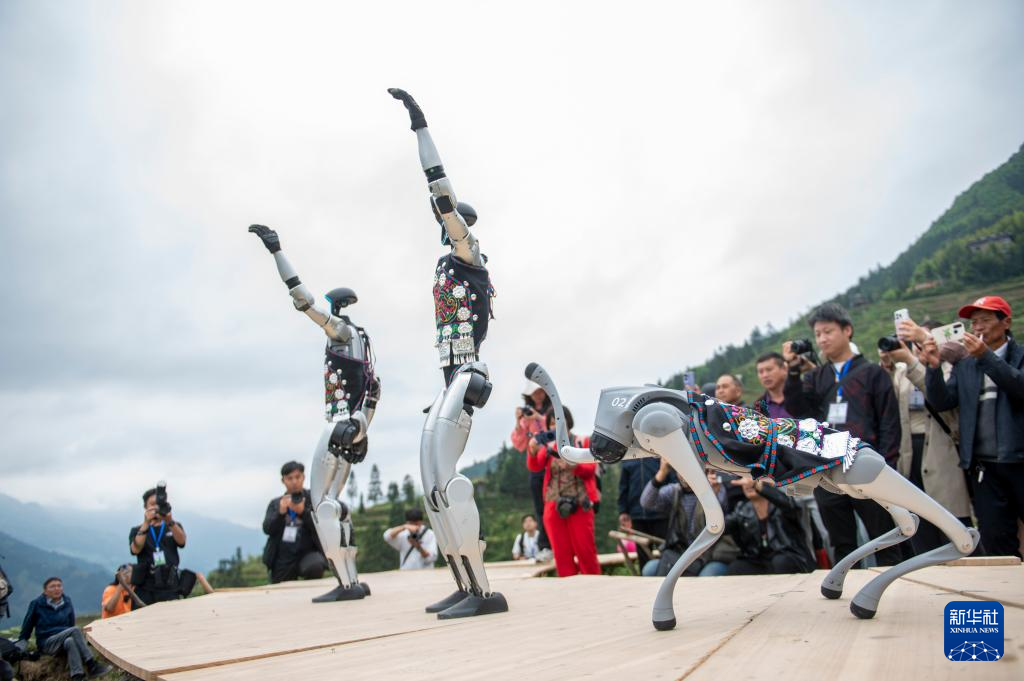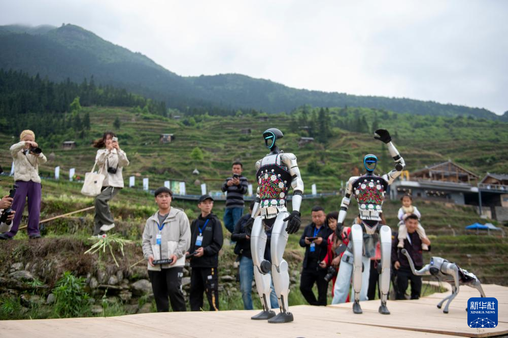 4月26日,机器人在贵州省从江县加榜梯田上参加梯田走秀活动。